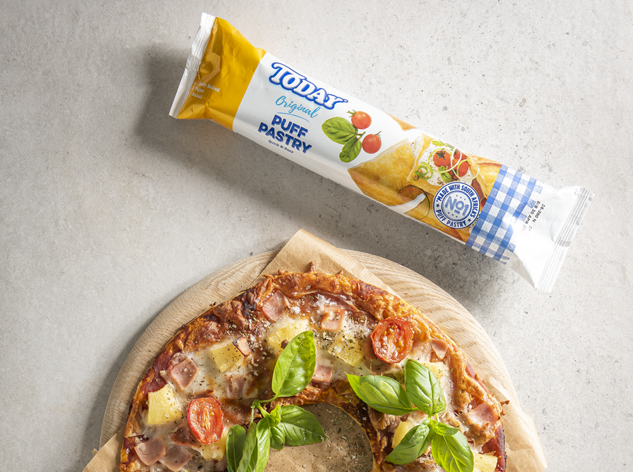 Place the camembert into the middle of the square and top with fruit chutney and thyme. Fold over the edges to create a parcel.